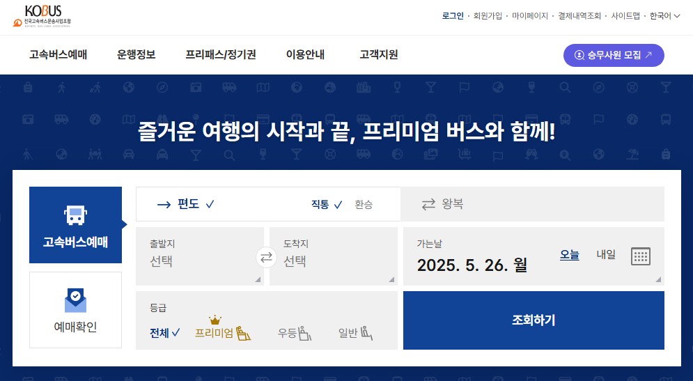 https://www.kobus.co.kr로 접속해요. 메인 화면에서 ‘시간표 조회’ 버튼을 찾아 클릭하세요.