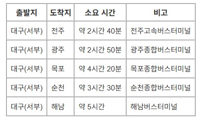 출발지에는 ‘대구(서부)’, 도착지에는 가고 싶은 도시를 입력하세요. 예: ‘대구(서부) → 전주’ 이렇게 입력하면 돼요.