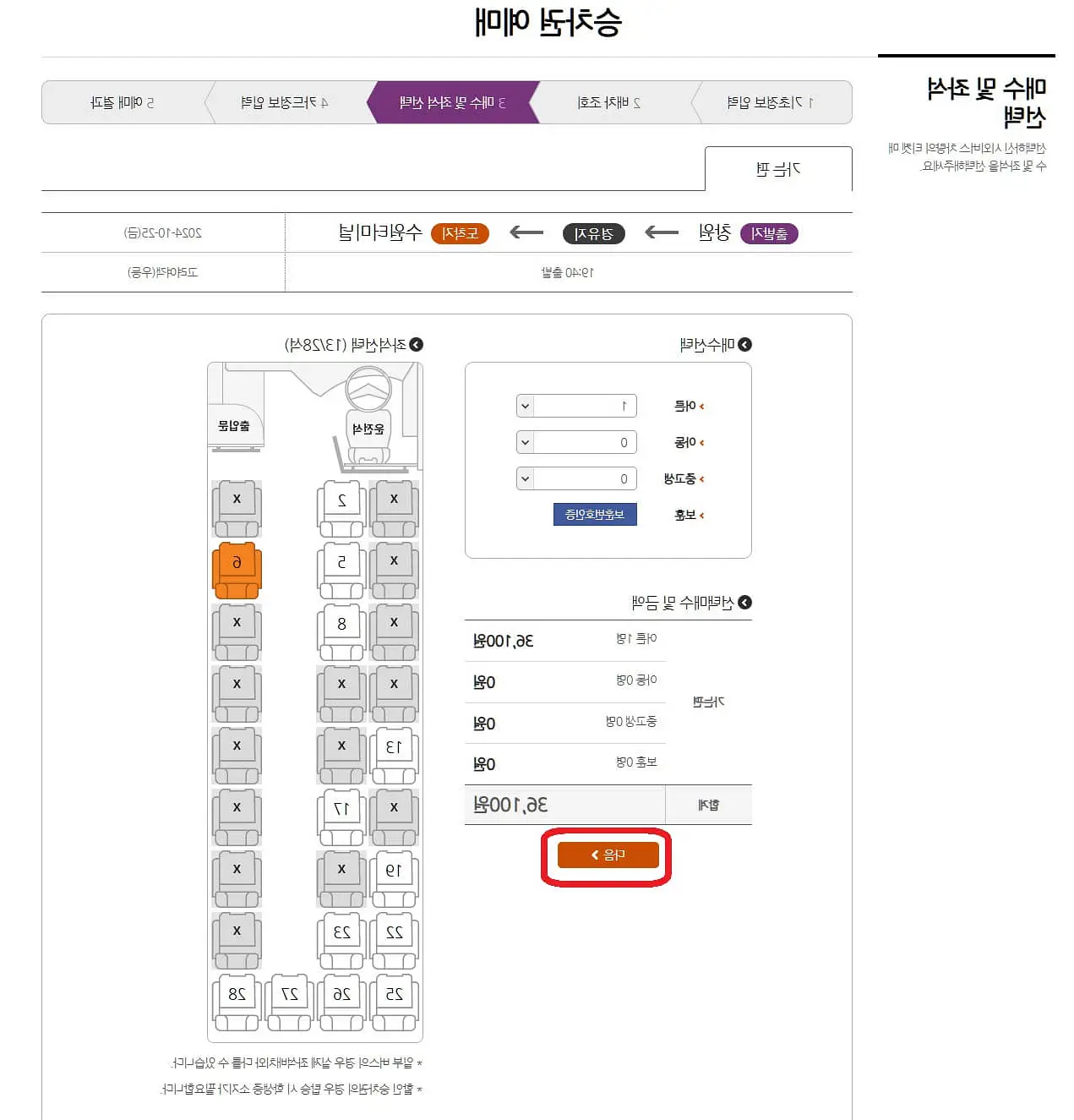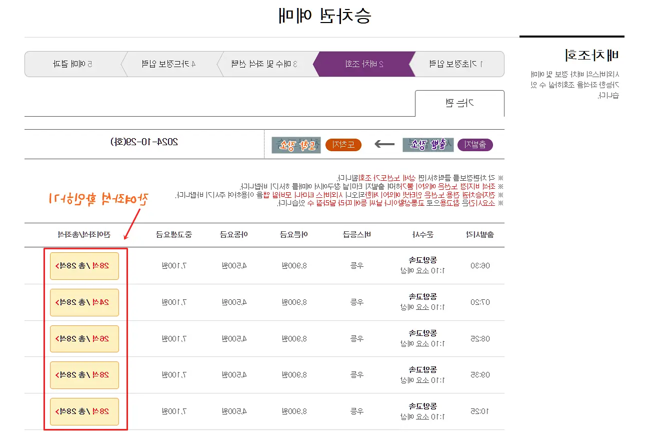 이동할 날짜와 탑승 인원을 선택한 후, 조회 버튼을 누르세요.
