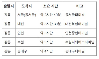 출발지에 ‘강릉’, 도착지에 원하는 지역을 입력하세요. 예: 강릉 → 서울(동서울)