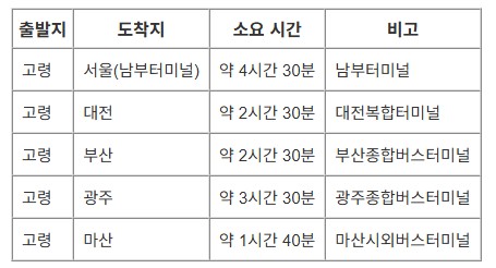 출발지에 ‘고령’, 도착지에 원하는 지역을 입력하세요. 예: 고령 → 서울(남부터미널)