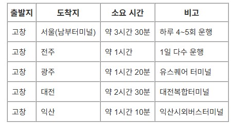 고창시외버스터미널 주요 버스 노선