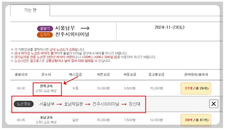 출발 시각과 노선을 확인한 후 선택합니다.