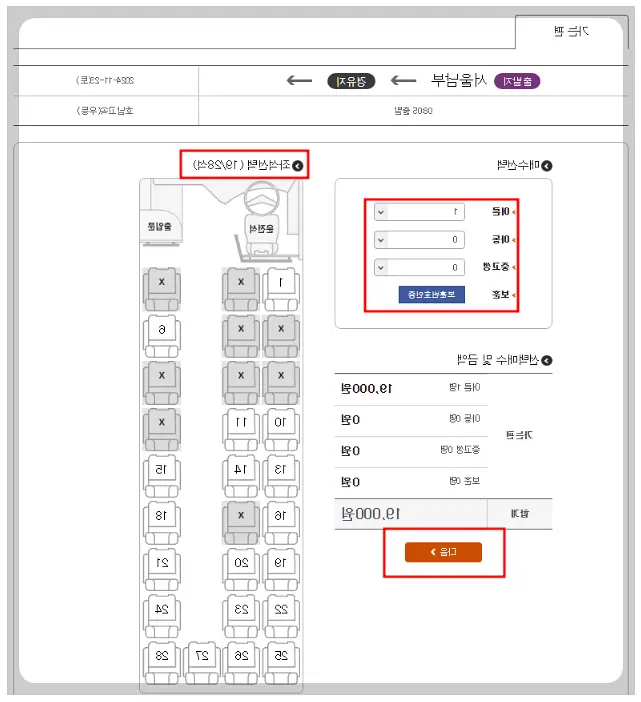 이동 날짜와 인원을 입력한 후 조회 버튼을 클릭합니다.