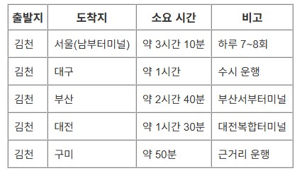 출발지에 ‘김천’, 도착지에 가고 싶은 도시를 입력하세요. 예: 김천 → 서울