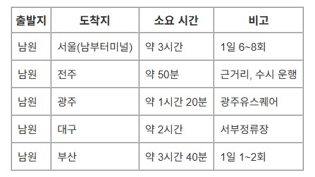 출발지에 ‘남원’, 도착지에 가고자 하는 지역을 입력합니다. 예: 남원 → 서울