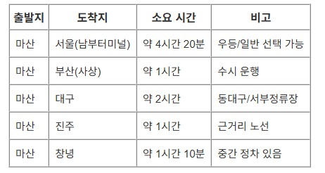 출발지에 ‘마산’, 도착지에 원하는 지역을 입력하세요. 예: 마산 → 서울