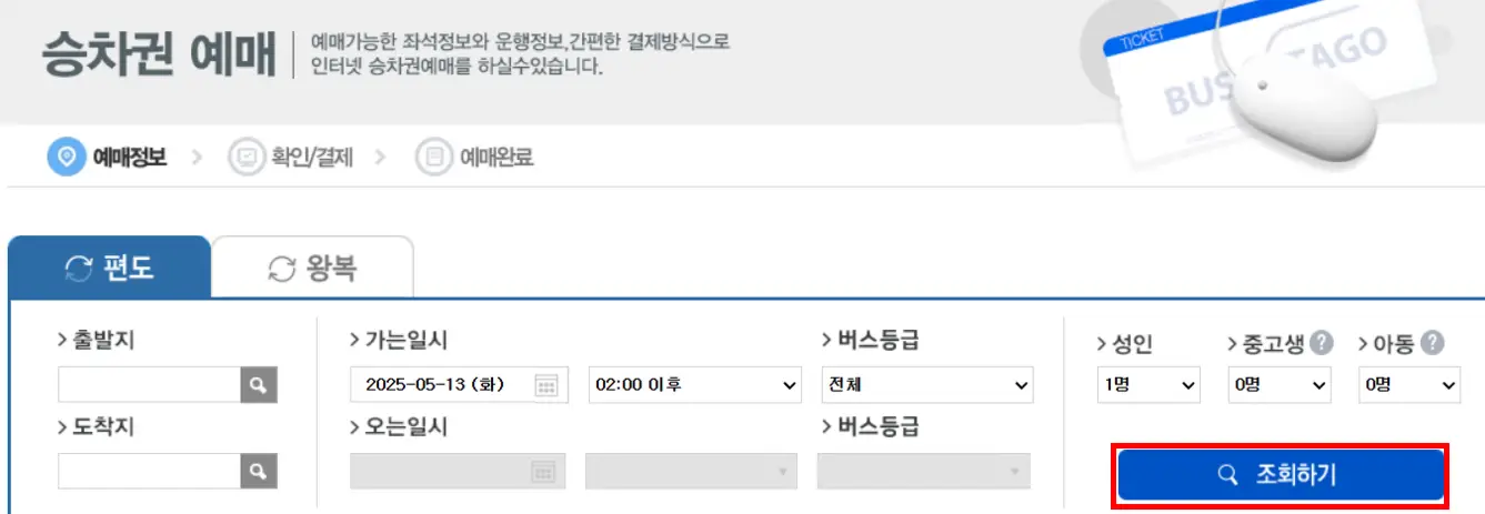 탑승 날짜와 인원을 선택한 뒤 ‘조회’ 버튼을 클릭하세요.