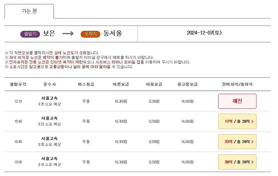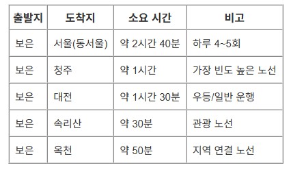 출발지에 ‘보은’, 도착지에 원하는 지역을 입력하세요. 예: 보은 → 서울