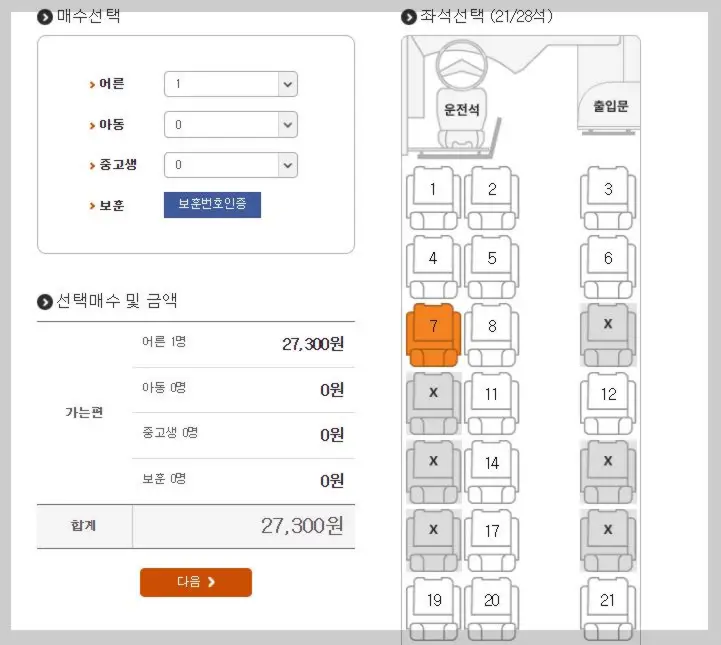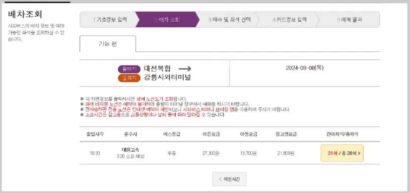 조회된 결과 중 원하는 시간대를 선택합니다.