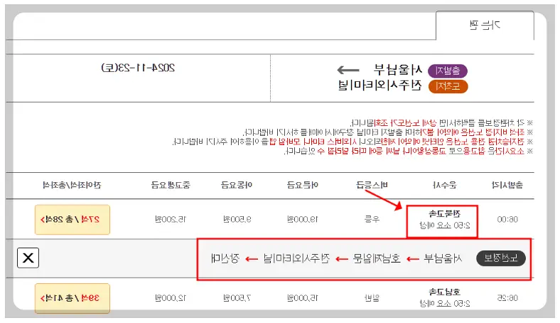 출발 시간, 잔여 좌석, 도착 시간 등을 한눈에 확인할 수 있습니다.