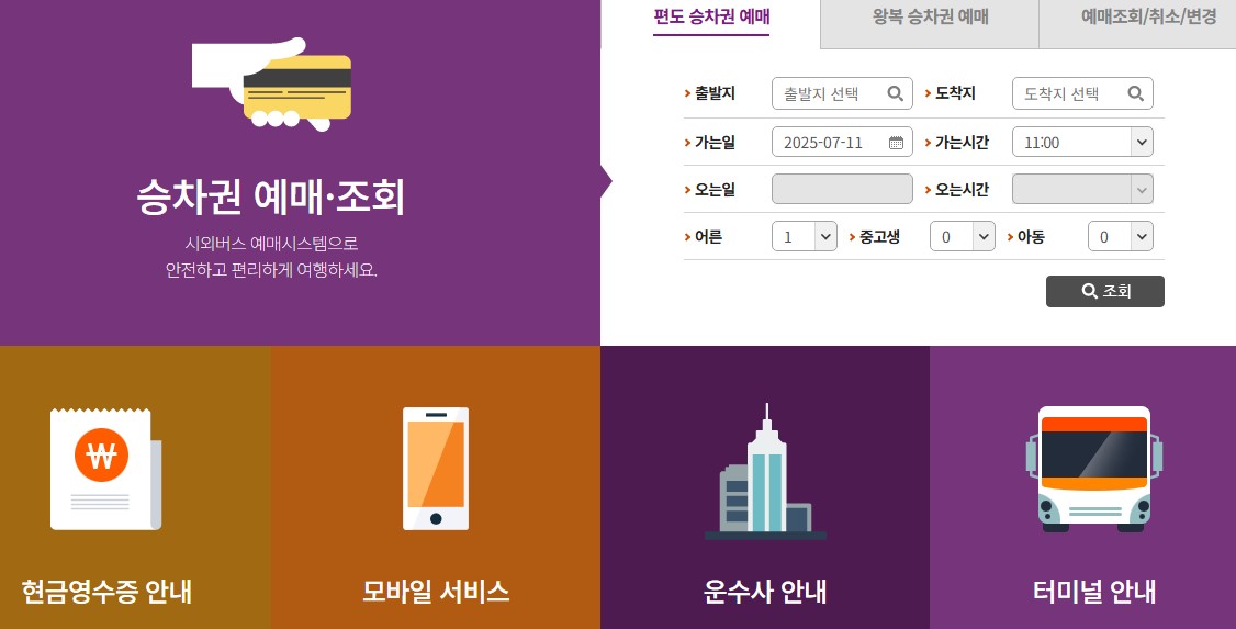 출발 시간, 잔여 좌석, 요금, 소요 시간 등을 실시간으로 확인할 수 있습니다.