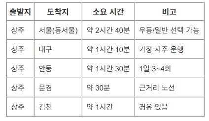 출발지에 ‘상주’, 도착지에 가고 싶은 지역을 입력하세요. (예: 상주 → 서울)