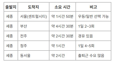 출발지에 ‘세종’을, 도착지에 원하는 지역을 입력하세요. 예: 세종 → 서울