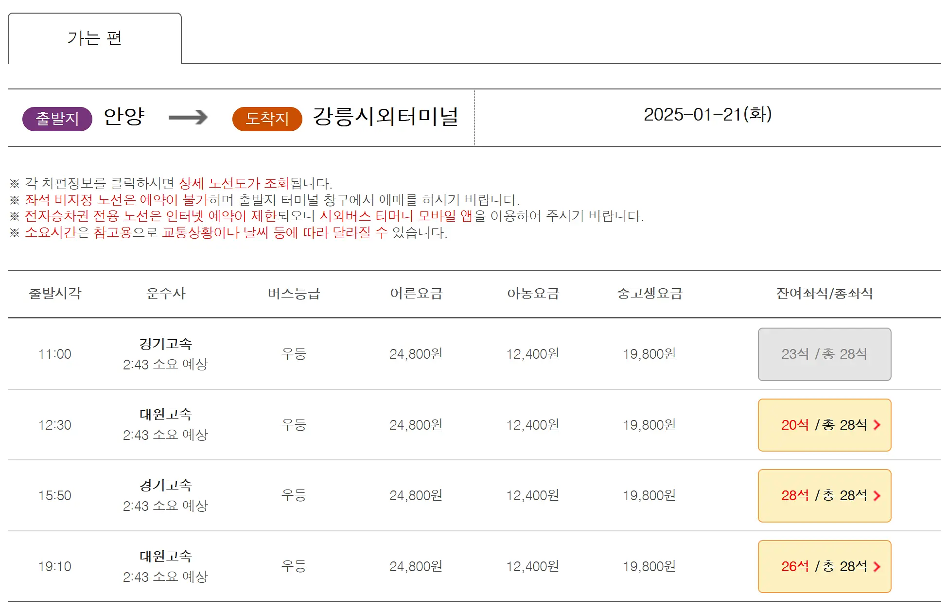 출발 시간, 요금, 잔여 좌석, 소요 시간 등을 확인할 수 있어요.