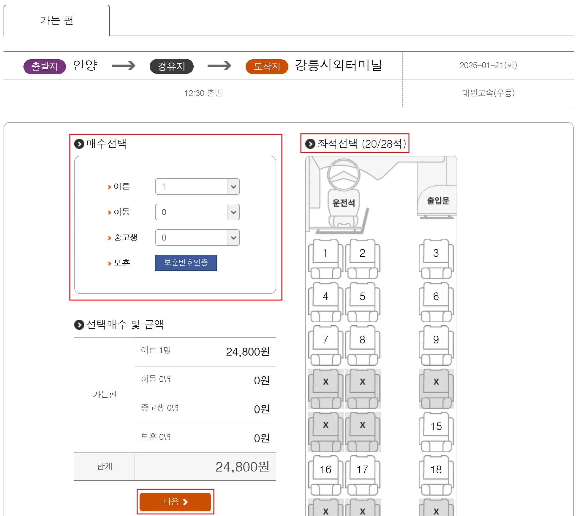 남은 좌석 중 원하는 자리를 선택합니다.
