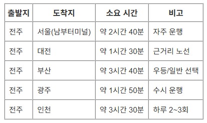 출발지에 ‘전주’, 도착지에 원하는 지역을 입력하세요. 예: 전주 → 서울
