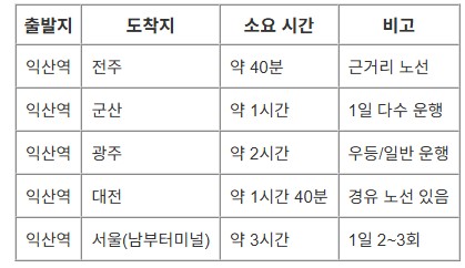 출발지에 ‘익산역’, 도착지에 원하는 지역을 입력하세요. 예: 익산역 → 전주