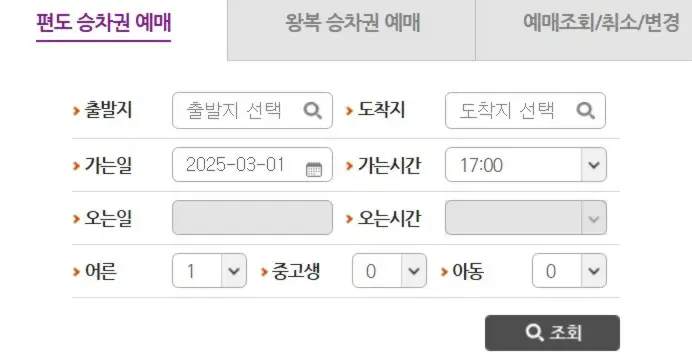 탑승일과 인원을 선택하고 '조회' 버튼을 클릭하세요.