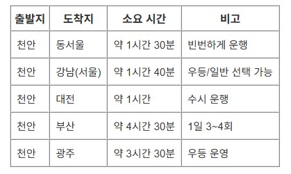 출발지에 ‘천안’, 도착지에 원하는 지역을 입력하세요. 예: 천안 → 동서울
