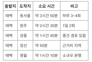 출발지에 ‘태백’, 도착지에 원하는 도시를 입력하세요. 예: 태백 → 동서울