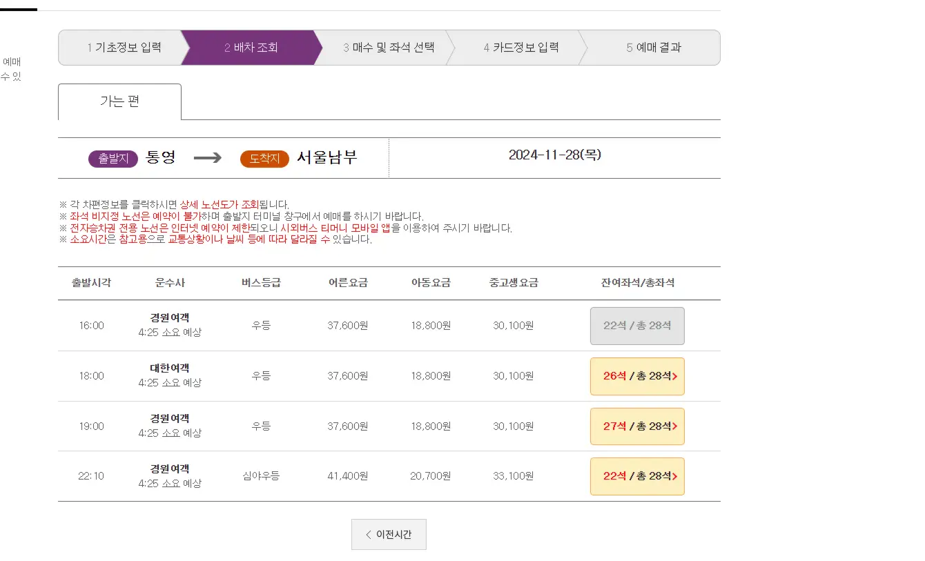 운행 시간, 소요 시간, 잔여 좌석 등을 실시간으로 확인할 수 있어요.