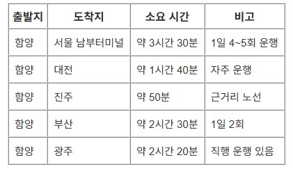 출발지에 ‘함양’, 도착지에 원하는 도시를 입력하세요. 예: 함양 → 대전