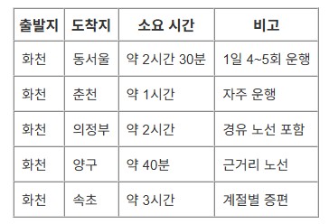 출발지에 ‘화천’, 도착지에 원하는 지역을 입력하세요. 예: 화천 → 동서울
