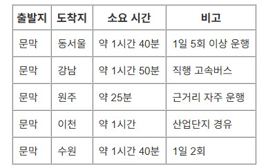 문막시외버스터미널 주요 버스 노선