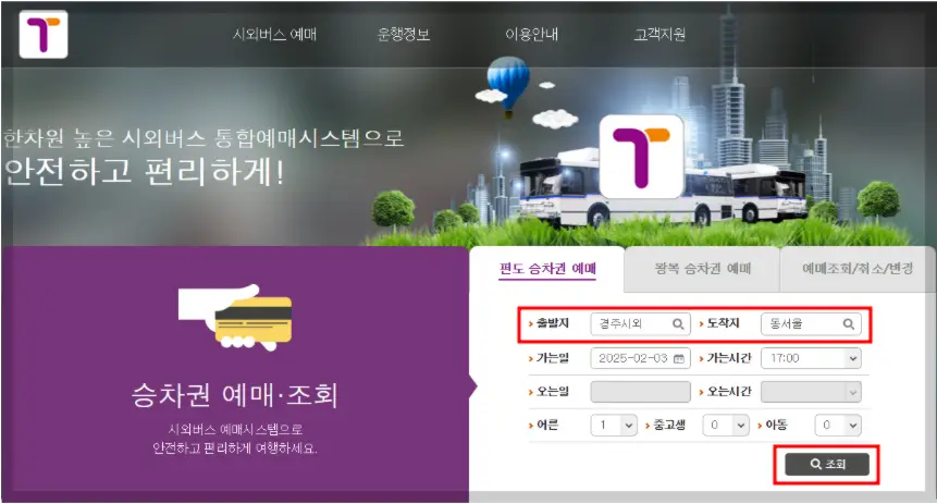 탑승 날짜와 인원을 선택하고 ‘조회’ 버튼을 클릭하세요.