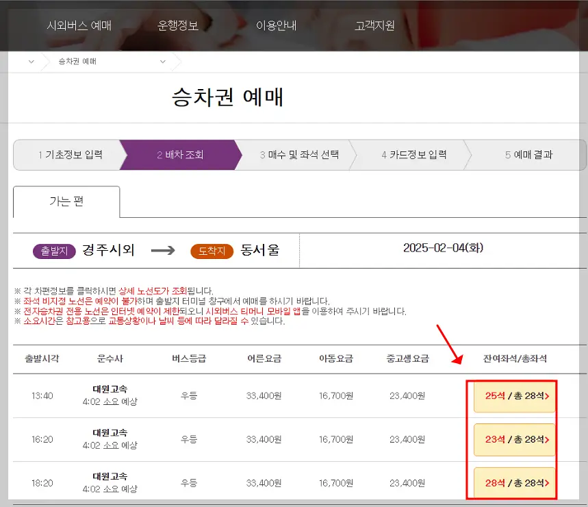 운행 시간, 잔여 좌석, 요금 정보를 실시간으로 확인할 수 있어요.