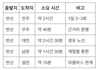 출발지에 ‘반선’, 도착지에 원하는 지역을 입력하세요. 예: 반선 → 전주