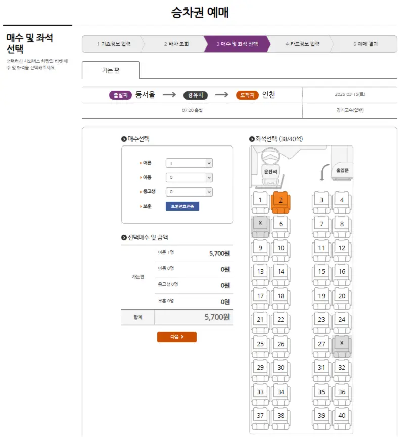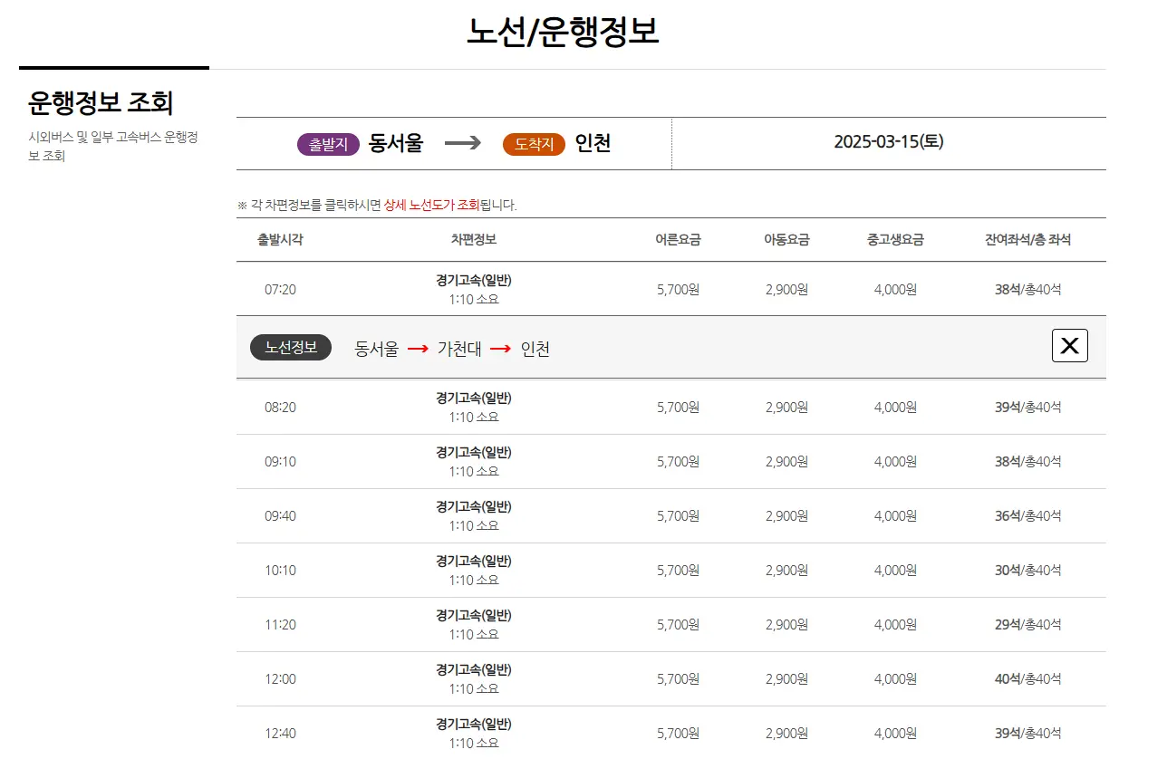 운행 시간, 잔여 좌석, 요금 정보를 실시간으로 확인할 수 있어요.