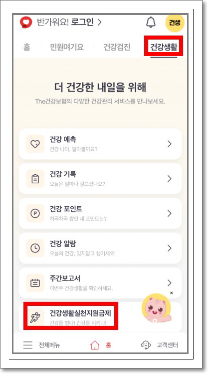 2. 상단 '건강생활' 메뉴 클릭합니다.