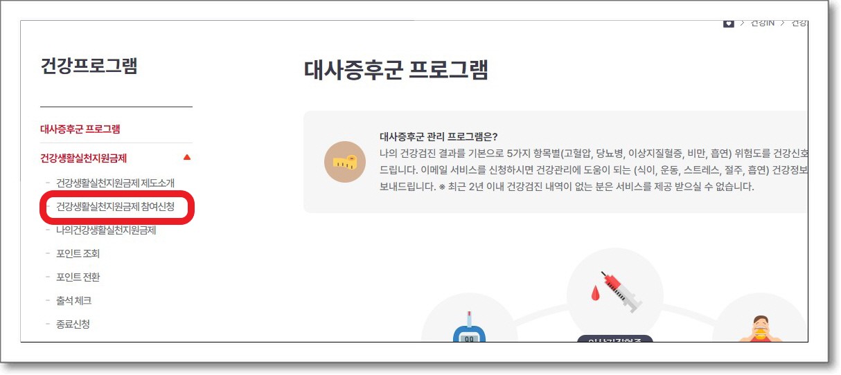 - 건강프로그램 페이지에서 '건강생활실천지원금제' 메뉴에서 '건강생활실천지원금제 참여신청' 버튼을 클릭합니다.