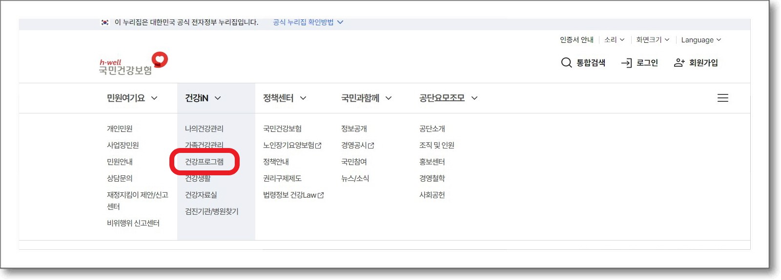 - 홈페이지 상단 메뉴에서 '건강정보' 탭을 선택한 후, '건강프로그램'을 클릭합니다.