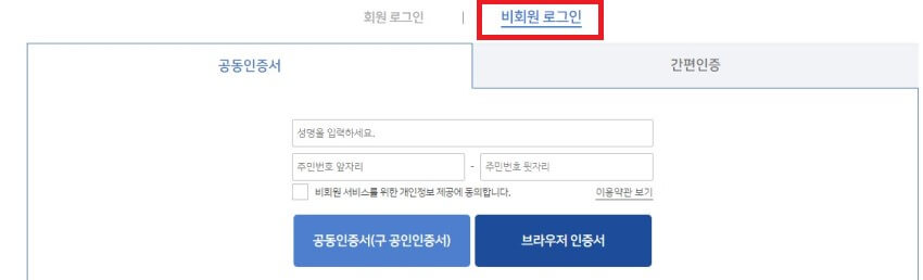 - 비회원 로그인: 인증서를 보유하지 않은 경우 비회원으로 로그인