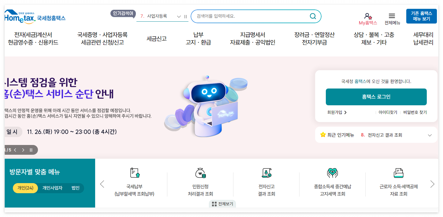 먼저 개인사업자가 부가세는 온라인으로도 간편하게 신고할 수 있습니다. 이 서비스는 국세청 홈택스에서 제공을 하고 있는데요. 먼저 홈택스에 접속해 주세요.