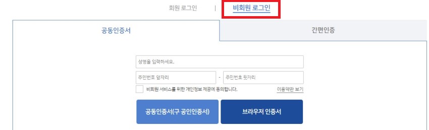 - 비회원 로그인: 인증서를 사용하지 않고 간단히 로그인