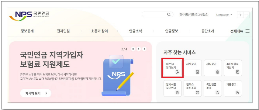 홈페이지에 접속하면 오른쪽 화면에 자주 찾는 서비스 메뉴가 보입니다. 여기에서 "내 연금 알아보기"를 클릭해 주세요. 이 메뉴를 통해 예상 수령액을 확인할 수 있는 페이지로 이동합니다.