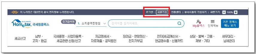 홈택스 회원가입은 상단 메뉴에서 "회원가입"을 클릭하여 진행할 수 있습니다. 가입 유형에 따라 아래의 절차를 따라주세요.